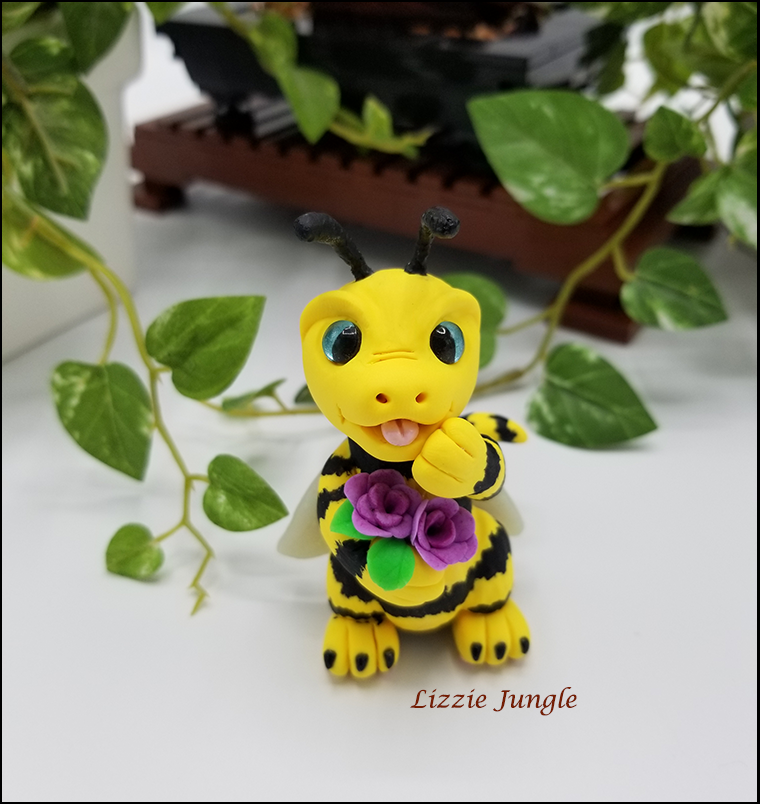 He is made of high quality flexible polymer clay that will last a life time. The clay is waterproof and its color will not dry out or fade. He is one of a kind (OOAK) fantasy Standing Bumble Bee Dragon.
