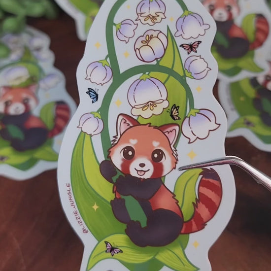 Red Panda holding Lily of The Valley vinyl sticker to decorate your laptop, water bottle, etc.