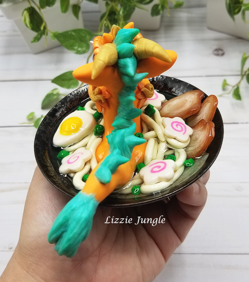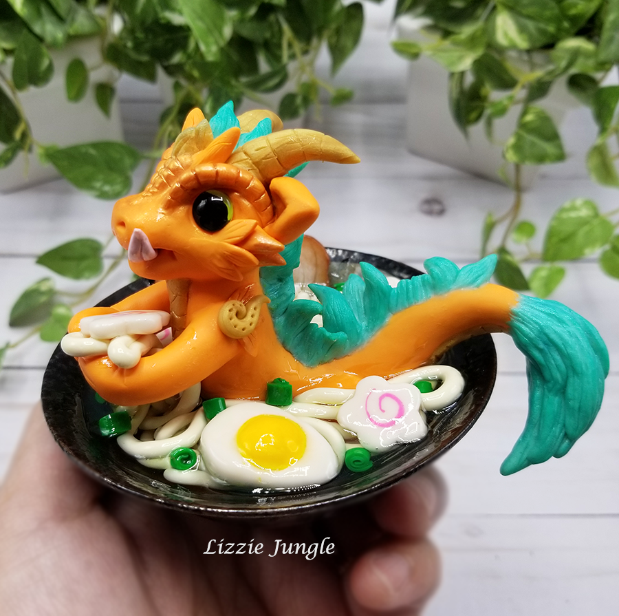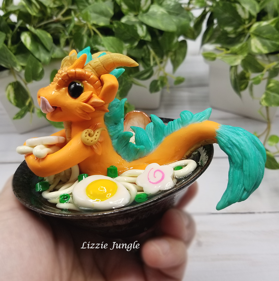 He is made of high quality flexible polymer clay that will last a life time. The clay is waterproof and its color will not dry out or fade. He is one of a kind (OOAK) Orange Ramen Dragon.